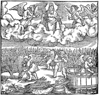 Description: The angels gather the harvest at the end of the age, as God looks on with pruning hook in hand.