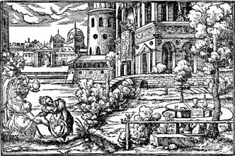 Description: As David looks down from a palace balcony, Bathsheba bathes in a pool, accompanied by her attendants. The artist, Virgil Solis (1514-1562), has placed his monogram in the lower left corner of the woodcut.