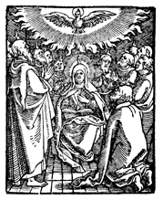 Description: At Pentecost the Holy Spirit descends on Jesus’ disciples, who are gathered around Mary.