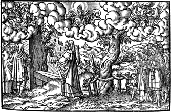 Description: The prophet Zechariah speaks to the people, as the triumphal entry and visions of his prophecy are depicted in the heavens. The artist, Virgil Solis (1514-1562), has placed his monogram in the lower left corner of the woodcut. In addition there is the engraver’s knife and a plus sign (+) in the lower right corner.