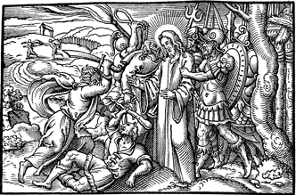 Description: Jesus is kissed by Judas and arrested by the multitude, while one of Jesus disciples cuts off the ear of the high priest’s slave.