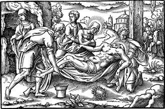 Description: Joseph of Arimathea, Mary, and Mary Magdalene prepare the body of Jesus for burial.