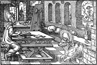 Description: As the evangelist Luke composes his gospel account, his attribute the ox before him, he gazes to a vision of the crucifixion of Jesus in the distance. A painter’s easel and palate are in the corner, reminding the viewer that Luke is the patron saint of artists. The artist, Virgil Solis (1514-1562), has placed his monogram in the lower right corner of the woodcut. In addition there is the engraver’s knife and the numeral 11.
