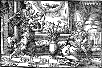 Description: The angel Gabriel visits Mary and announces that she will give birth to Jesus. The artist, Virgil Solis (1514-1562), has placed his monogram in the lower left corner of the woodcut.