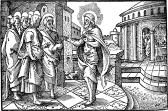 Description: Jesus reveals himself to his disciples after the resurrection. In the background he eats fish to prove he is not a ghost.