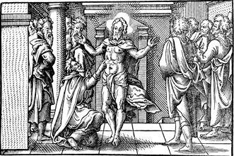 Description: Jesus appears to Thomas, who had doubted his resurrection, and shows the marks from his crucifixion.