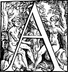Description: An initial letter A featuring Adam and Eve taking the forbidden fruit from the tree of the knowledge of good and evil.