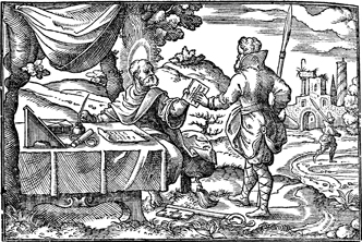 Description: The apostle Peter gives a letter to a messenger. A key, Peter’s attribute, is shown lying on the ground at his feet.