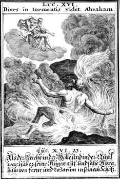 Description: The rich man is tormented in Hades while Lazarus sits at Abraham’s side.