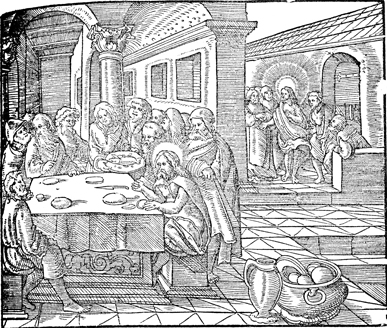 Description: Jesus appears to his disciples following his resurrection. In the foreground, he is served a piece of broiled fish.