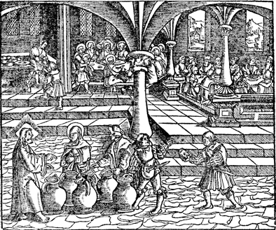 Description: At his mother, Mary's, request, Jesus turns water into wine at a wedding feast in Cana. This image is found in a sermon on marriage that uses Hebrews 13 as its text.