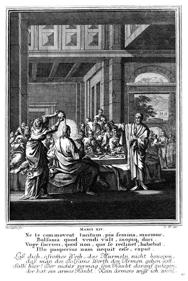 Description: An adulteress woman anoints Jesus with oil at the home of Simon the Leper in Bethany.