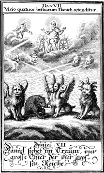 Description: As the four winds blow upon the waters, out of the sea emerge four beasts: one with the head of a lion and wings of the eagle; a second was in the form of a bear and had three ribs in its mouth; the third beast had four heads and four wings; and the fourth beast had long teeth, multiple horns, and hooves like those of an ox. The Ancient One is enthroned on the clouds at the top.