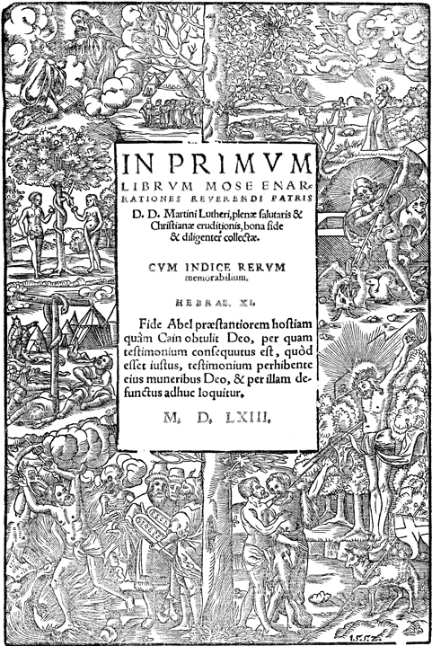 Description: This historiated title-page border is based on the Gotha version of Lucas Cranach the Elder’s painting, “Law and Gospel” (or “Sin and Redemption”). The tree at the center is dead on the left but alive on the right, representing Law and Gospel, respectively, and on the side of each is a cluster of illustrative images. The woodcut is dated 1552 (lower right).