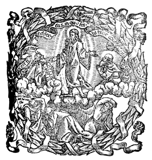 Description: The printer's device of Johann vom Berg (d. 1563) and Ulrich Neuber, where Jesus is transfigured in the presence of Moses, Elijah, Peter, James, and John.