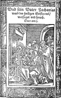 Description: Zechariah is presented with his infant son, John the Baptist..