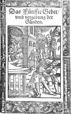 Description: Illustrating the fifth petition in the Lord’s Prayer, "And forgive us our debts as we forgive our debtors," this image depicts the Parable of the Unmerciful Servant..