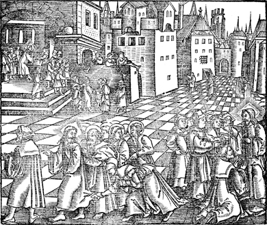 Description: To the right, a synagogue official asks Jesus to resurrect his daughter; while to the left, a woman with a hemorrhage touches Jesus' cloak for healing. In the background to the left, Jesus reaches the house of the synagogue official and resurrects his daughter.