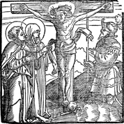 Description: Jesus is crucified as the Suffering Servant, as his mother Mary, the Beloved Disciple, and a centurion stand by the cross.