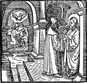 Description: Jesus converses with Nicodemus at night. In the background is a baptism with water, and the Holy Spirit in the form of a dove.