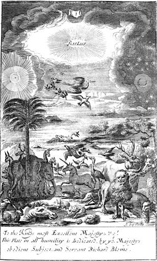 Description: In this illustration of creation, the declaration of God, "Let there be light," is rendered in Latin, FIAT LUX. The name of the artist, G. Freman, and the engraver, Johannes Kip (1653-1722), are set at the foot, and as the numeral at the head of the page indicates, this is plate #1 in a series of illustrations.