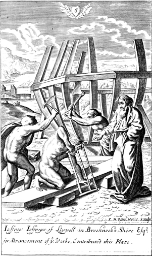 Description: Noah provides instruction, as his sons build the ark. As the numeral at the head of the page indicates, this is plate #6 in a series of illustrations, and the artist, Frederick Hendrick van Hove (1628?-1698), is responsible for the work.
