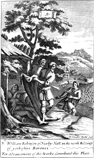 Description: Ham dishonors Noah by pointing out his nakedness, but Shem and Japheth cover their father with a sheet. As the numeral at the head of the page indicates, this is plate #9 in a series of illustrations, and the engraver, Michael van der Gucht (1660-1725), is responsible for the work.