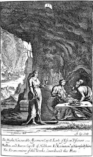 Description: Lot’s daughters seduce him after getting him drunk, as Sodom and Gomorrah burn in the background. In the distance, Lot’s wife has now become a pillar of salt after looking back toward the cities. As the numeral at the head of the page indicates, this is plate #17 in a series of illustrations. Additionally, the signatures of the artist, G. Freman, and the engraver, Johannes Kip (1653-1722), appear at the bottom.