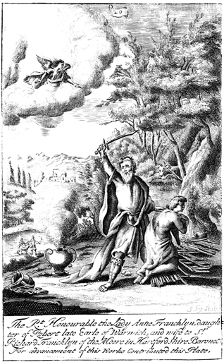 Description: After witnessing Abraham’s faith, an angel prevents him from sacrificing his son Isaac to God and supplies a ram instead for the sacrifice. As the numeral at the head of the page indicates, this is plate #20 in a series of illustrations . Additionally, the engraver, Johannes Kip (1653-1722), has placed his signature at the bottom right corner.