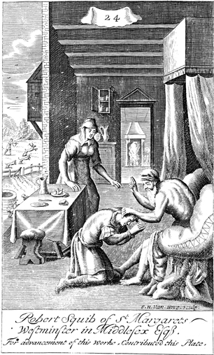 Description: Rebekah helps Jacob fool his father, Isaac, into giving him Esau’s blessing, while Esau is away hunting game (left). As the numeral at the head of the page indicates, this is plate #24 in a series of illustrations, and the artist or engraver’s name, Frederik Hendrik van den Hove (1628/29-1698), has been placed in the lower left corner of the woodcut.