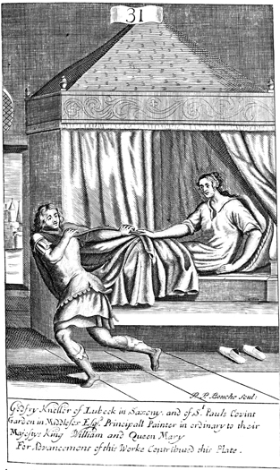 Description: As Potiphar’s wife attempts to seduce Joseph, he flees and leaves his tunic in her hand. As the numeral at the head of the page indicates, this is plate #31 in a series of illustrations, and the artist or engraver responsible for the work is Peter Paul Bouche (b. ca. 1646).