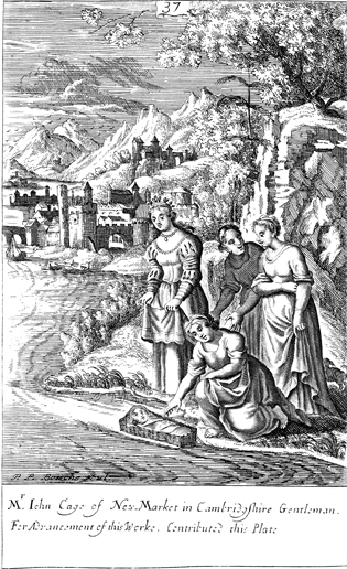 Description: Pharaoh's daughter finds the baby Moses on the Nile River. The name of the engraver, Peter Paul Bouche (b. ca. 1646), has been set at the foot of the image, and as the numeral at the head of the page indicates, this is plate #37 in a series of illustrations.