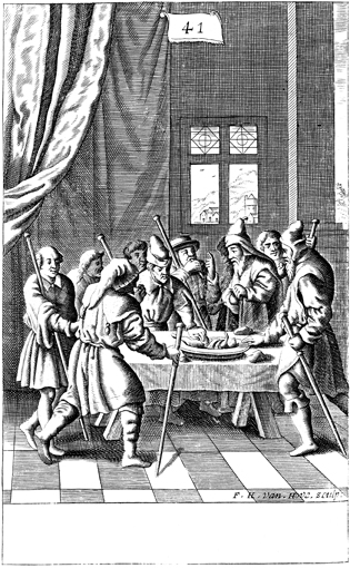 Description: Standing around the table with staffs in hand, Israelites eat the Passover meal.