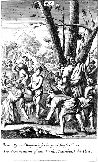 Description: The Israelites gather manna as it falls from heaven. The name of the engraver, Peter Paul Bouche (b. ca. 1646), has been set at the foot of the image, and as the numeral at the head of the page indicates, this is plate #43 in a series of illustrations.