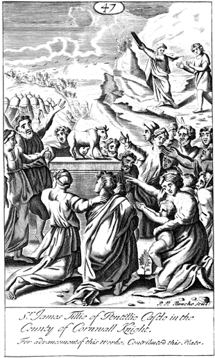 Description: Moses prepares to throw the tablets of the Ten Commandments, as the people worship the golden calf. As the numeral at the head of the page indicates, this is plate #47 in a series of illustrations, and the engraver responsible for the work, Peter Paul Bouche (b. ca. 1646).