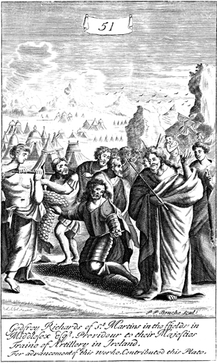 Description: Joshua and Caleb return from the exploration of Canaan and report to Moses of its abundance, indicated by the large size of the grape clusters they bear. As the numeral at the head of the page indicates, this is plate #51 in a series of illustrations, and the name of the engraver, Peter Paul Bouche (b. ca. 1646), has been set at the base.