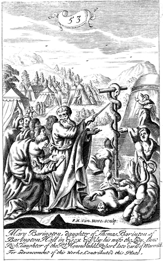 Description: Moses provides a bronze serpent that whoever looks upon it may survive the venomous snake bites. The name of the artist, Frederick Hendrick van Hove (1628-1698), has been set at the base, and as the numeral at the head of the page indicates, this is plate #53 in a series of illustrations.