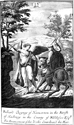Description: Balaam beats his donkey for stopping as an angel stands in its way with sword raised. The name of the engraver, Johannes Kip (1653-1722), has been set at the lower right, and as the numeral at the head of the page indicates, this is plate #54 in a series of illustrations.