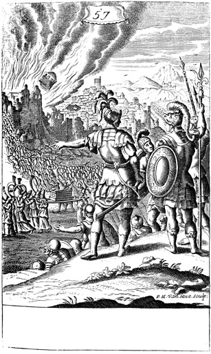Description: The walls of Jericho begin to fall as the Israelites march around the city with the Ark of the Covenant and blow their trumpets. The name of the artist, Frederick Hendrick van Hove (1628-1698), has been set at the base, and as the numeral at the head of the page indicates, this is plate #57 in a series of illustrations.