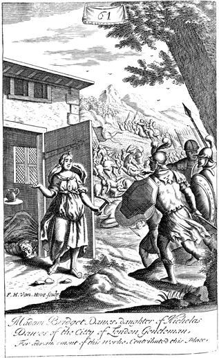 Description: Jael shows Barak the dead Sisera in her house. The name of the artist, Frederick Hendrick van Hove (1628-1698), has been set at the base, and as the numeral at the head of the page indicates, this is plate #61 in a series of illustrations.