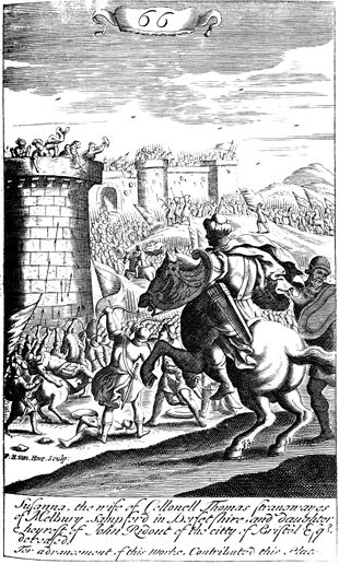 Description: A woman kills Abimelech by dropping a millstone on him from the tower above The name of the artist, Frederick Hendrick van Hove (1628-1698), has been set at the base, and as the numeral at the head of the page indicates, this is plate #66 in a series of illustrations.