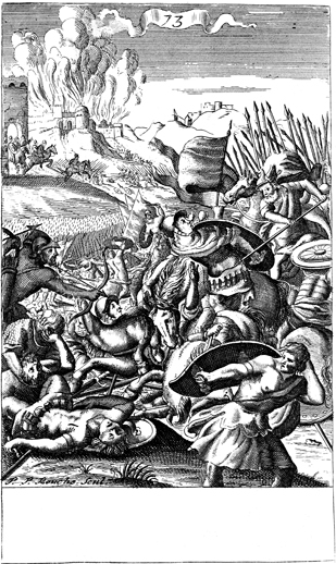 Description: Israel goes to war with the tribe of Benjamin because of the concubine who was raped and murdered in Gibeah. As the numeral at the head of the page indicates, this is plate #73 in a series of illustrations, and the artist responsible for the image was Peter Paul Bouche (b. ca. 1646).