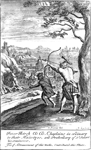 Description: Jonathan informs David that Saul still wants to kill him by shooting an arrow. The names of the artist, G. Freman, and the engraver, Johannes Kip (1653-1722), have been set at the foot, and as the numeral at the head of the page indicates, this is plate #88 in a series of illustrations.