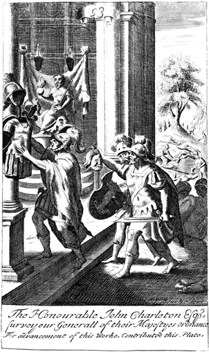 Description: The Philistine soldiers fasten Saul's armor to the Temple of the Ashtoreth's as they carry Saul's head. As the numeral at the head of the page indicates, this is plate #93 in a series of illustrations, and the name of the engraver, Peter Paul Bouche (b. ca. 1646), has been set at the base.