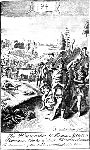 Description: As David brings the ark of God into Jerusalem on a cart driven by oxen, Uzzah touched the ark to steady it; as a result, the Lord struck down Uzzah, and David was angry and afraid to keep the ark. The name of the engraver, Michael van der Gucht (1660-1725), has been set at the foot, and as the numeral at the head of the page indicates, this is plate #94 in a series of illustrations.