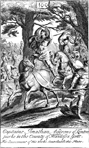 Description: While Absalom is defenseless, hanging by his hair (or head) from a tree, Joab seizes the opportunity to slay him. The names of the artist, G. Freman, and the engraver, Johannes Kip (1653-1722), have been set at the foot, and as the numeral at the head of the page indicates, this is plate #100 in a series of illustrations.