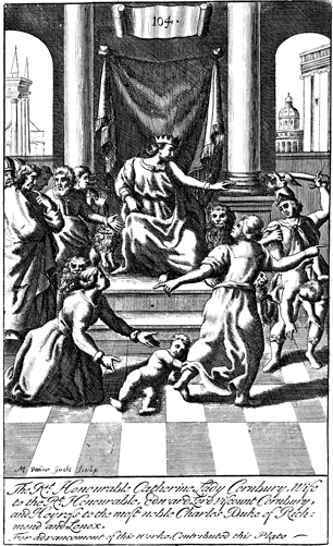 Description: Solomon appears on his throne as two women approach, both claiming custody of a baby. Solomon's servant stands with drawn sword to divide the child between the two women. The name of the engraver, Michael van der Gucht (1660-1725), has been set at the foot, and as the numeral at the head of the page indicates, this is plate #104 in a series of illustrations.