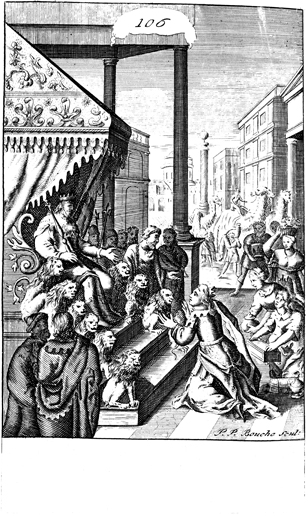 Description: The Queen of Sheba visits King Solomon in Jerusalem. As the numeral at the head of the page indicates, this is plate #106 in a series of illustrations, and the name of the engraver, Peter Paul Bouche (b. ca. 1646), has been set at the base.