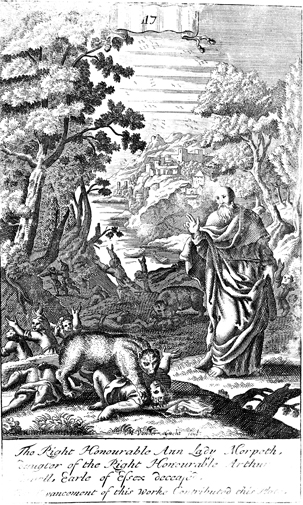 Description: After Elisha pronounces a curse on youths who mock him, two bears come from the woods to maul the 42 youths. The name of the engraver’s name, Michael van der Gucht (1660-1725), has been set at the foot, and as the numeral at the head of the page indicates, this is plate #117 in a series of illustrations.