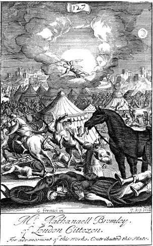 Description: In fulfillment of Isaiah’s prophecy, God delivers Hezekiah and Jerusalem by sending an angel through the Assyrian camp at night, slaying 185,000 men. The names of the artist, G. Freman, and the engraver, Johannes Kip (1653-1722), have been set at the base, and as the numeral at the head of the page indicates, this is plate #127 in a series of illustrations.